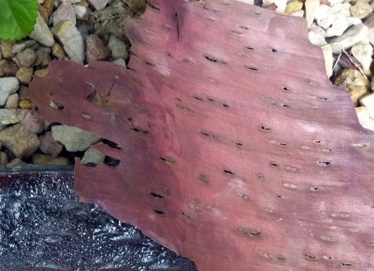 Este verano fuimos toda la familia a pasear por el Parque Pereyra, mi hija quería pasar «un día de campo». Lo cierto es que no logramos un gran día de campo, pero entre los muchos tesoros que me trajeron mis criaturas, apareció esta corteza que des del primer momento me hizo tilín. Me gustó el patrón de los agujeros, la direccionalidad, de algún modo me acercaba al mundo líquido, a los reflejos del agua en calma.